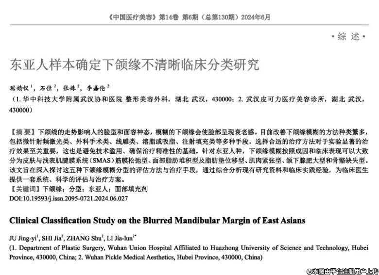 摘要:下頜線的走勢影響人的臉型和面容神態(tài),模糊的下頜緣會使臉部呈現(xiàn)衰老感。目前改善下頜緣模糊的方法種類繁多,包括微針射頻激光“類、外科手術(shù)類、線雕類、溶脂或吸脂、注射填充類等多種手段。選擇合適的治療方法對于實驗顯著的治療效果至關(guān)重要,這也是避免技術(shù)濫用、確保治療精準(zhǔn)性的基礎(chǔ)。針對東亞人種,下頜緣模糊按照成因和臨床表現(xiàn)可以大致分為皮膚與淺表肌腱膜系統(tǒng)(SMAS)筋膜松弛型、面部脂肪堆積型及脂肪墊位移型、肌肉緊張型、頜下腺肥大型和骨骼缺失型。該文旨在深入探討這五種下頜緣模糊分型的評估方法與治療手段,通過綜合分析現(xiàn)有研究資料和臨床實踐經(jīng)驗,為臨床醫(yī)生提供一套系統(tǒng)、科學(xué)的評估與治療方案。