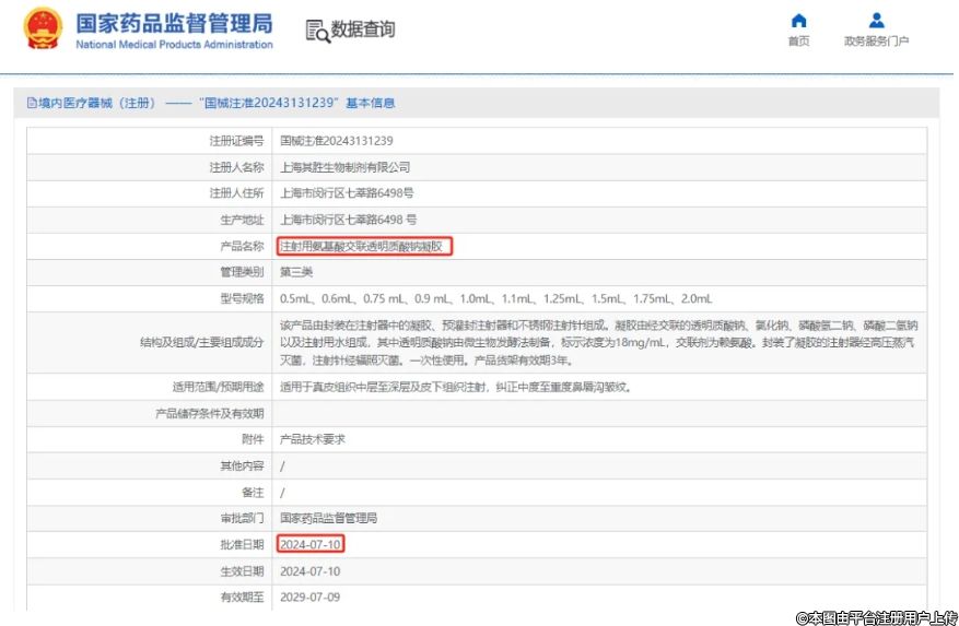 2024年7月10日,昊海生科旗下全資子公司上海其勝生物制劑有限公司申報的“注射用氨基酸交聯(lián)透明質(zhì)酸鈉凝膠”成功獲國家藥監(jiān)局批準(zhǔn),注冊證號:國械注準(zhǔn)20243131239。據(jù)悉,本產(chǎn)品基于公司自主研發(fā)的全球首創(chuàng)有機(jī)交聯(lián)工藝,系國內(nèi)唯一一款使用天然產(chǎn)物賴氨酸作為交聯(lián)劑的玻尿酸產(chǎn)品。