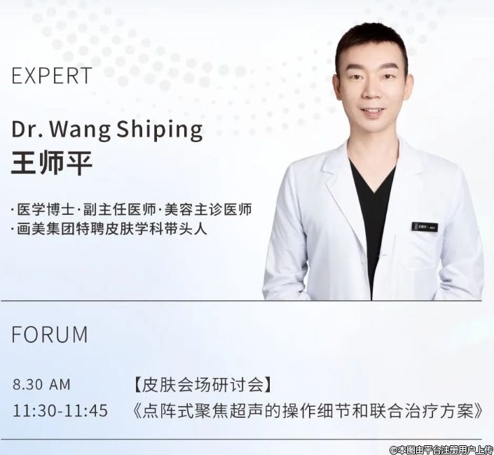 8月30日11:30-11:45,在西安國(guó)際會(huì)展中心會(huì)議樓二樓多功能廳C美容皮膚會(huì)場(chǎng),畫(huà)美集團(tuán)特聘皮膚學(xué)科帶頭人王師平博士將以《點(diǎn)陣式聚焦超聲的操作細(xì)節(jié)和聯(lián)合治療方案》為主題進(jìn)行現(xiàn)場(chǎng)分享,為與會(huì)嘉賓帶來(lái)更精煉的超聲王技術(shù)理論知識(shí),及更實(shí)用的臨床應(yīng)用經(jīng)驗(yàn)。
