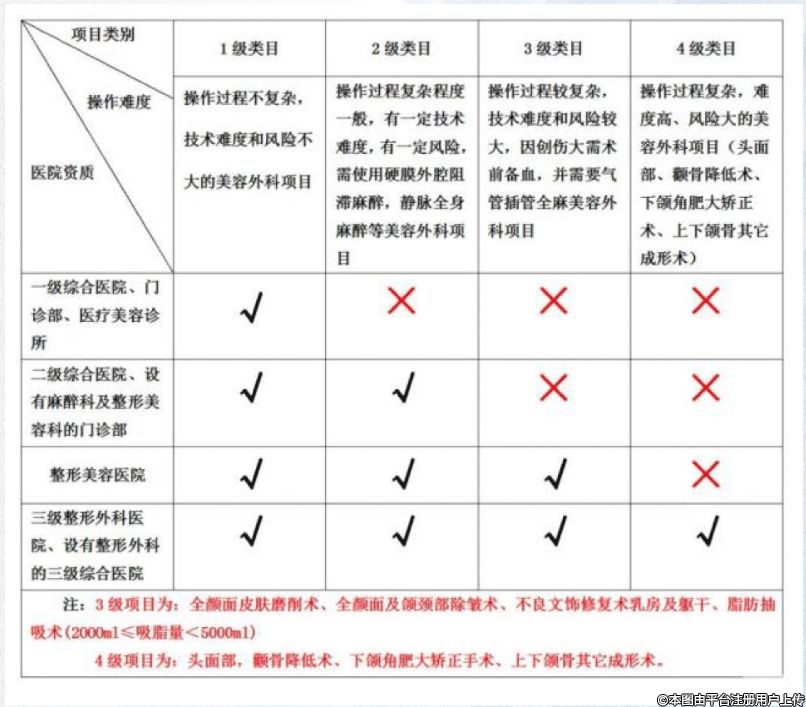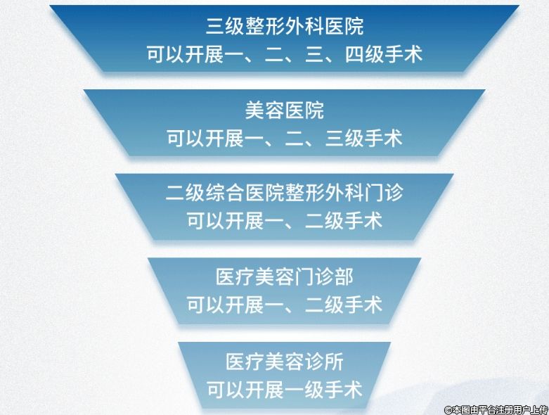 即醫(yī)療美容診所、設有醫(yī)療美容科或整形外科的一級綜合醫(yī)院可開展一級美容項目,設有麻醉科及醫(yī)療美容科或整形外科的門診部,或設有醫(yī)療美容科或整形外科的二級綜合醫(yī)院可開展一、二級醫(yī)療美容項目;美容醫(yī)院可開展一、二、三級醫(yī)療美容項目;三級整形外科醫(yī)院或設有整形外科或醫(yī)療美容科的三級綜合醫(yī)院可開展二、三、四級整形美容項目,可開展骨降低術、下頜角肥大矯正術、上下頜骨其他成形術等四級高難度手術。