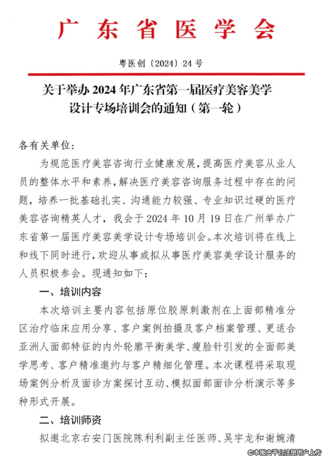 為規(guī)范醫(yī)療美容咨詢行業(yè)健康發(fā)展,提高醫(yī)療美容從業(yè)人員的整體水平和素養(yǎng),解決醫(yī)療美容咨詢服務(wù)過程中存在的問題,培養(yǎng)一批基礎(chǔ)扎實(shí)、溝通能力較強(qiáng)、專業(yè)知識(shí)過硬的醫(yī)療美容咨詢精英人才,我會(huì)于2024年10月19日在廣州舉辦廣東省第一屆醫(yī)療美容美學(xué)設(shè)計(jì)專場培訓(xùn)會(huì)。本次培訓(xùn)將在線上和線下同時(shí)進(jìn)行,歡迎從事或擬從事醫(yī)療美容美學(xué)設(shè)計(jì)服務(wù)的人員積極參會(huì)?,F(xiàn)通知如下: