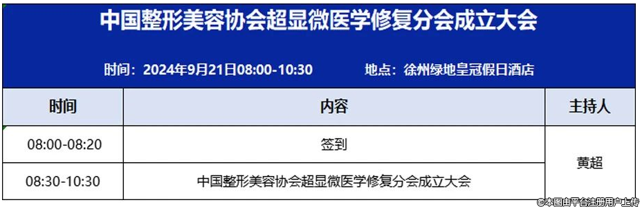 2024年9月20-21日,由中國(guó)整形美容協(xié)會(huì)主辦、徐州仁慈醫(yī)院承辦的中國(guó)整形美容協(xié)會(huì)超顯微醫(yī)學(xué)修復(fù)分會(huì)成立大會(huì)暨第一屆超級(jí)顯微醫(yī)學(xué)修復(fù)學(xué)術(shù)交流會(huì)即將在徐州隆重召開(kāi)。