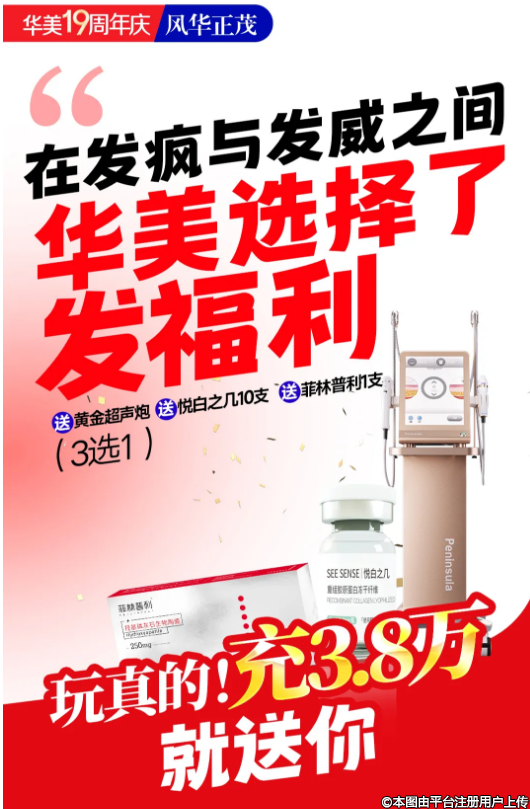 充值3.8w元,即可贈送項目3選1(悅白之幾10支/黃金超聲炮/菲林普利填充)!上萬塊的項目就這么到手了~這波不沖巨虧??!