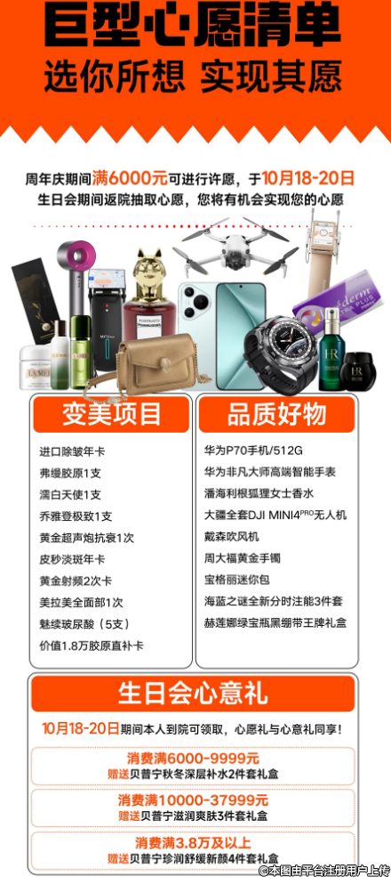 周年慶期間消費滿6000元,即有機會抽取進口淡皺年卡/喬雅登玻尿酸/皮秒淡斑/濡白天使/華為p70手機/周大福黃金手鐲等超豪華心愿清單!隨便抽中一個都爽到爆!