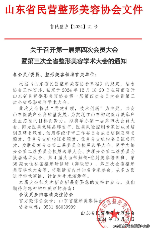 根據(jù)《山東省民營整形美容協(xié)會章程》的規(guī)定,結(jié)合協(xié)會工作安排,茲定于2024年12月18-20日在濟南召開山東省民營整形美容協(xié)會第一屆第四次會員大會暨第三次全省整形美容學術(shù)大會。