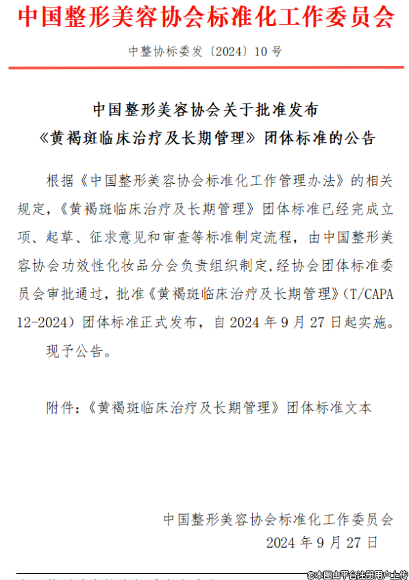 《黃褐斑臨床治療及長期管理》團(tuán)體標(biāo)準(zhǔn)的公告根據(jù)《中國整形美容協(xié)會標(biāo)準(zhǔn)化工作管理辦法》的相關(guān)規(guī)定,《黃褐斑臨床治療及長期管理》團(tuán)體標(biāo)準(zhǔn)已經(jīng)完成立項、起草、征求意見和審查等標(biāo)準(zhǔn)制定流程,由中國整形美容協(xié)會功效性化妝品分會負(fù)責(zé)組織制定,經(jīng)協(xié)會團(tuán)體標(biāo)準(zhǔn)委員會審批通過,批準(zhǔn)《黃褐斑臨床治療及長期管理》(T/CAPA12-2024)團(tuán)體標(biāo)準(zhǔn)正式發(fā)布,自2024年9月27日起實施。