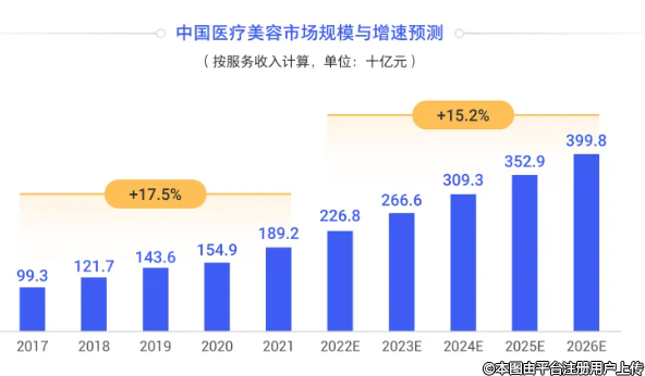 數(shù)據(jù)顯示,中國醫(yī)療美容市場自2017年起,以每年17.5%的符合增長率增長至2021年的近1,900億規(guī)模,而從2022年起,預(yù)計(jì)后續(xù)增長稍有放緩,以每年15.2%的復(fù)合增長率持續(xù)增長,呈現(xiàn)預(yù)計(jì)2023年全年市場規(guī)模將達(dá)2,666億元,預(yù)計(jì)2026年整個醫(yī)美市場將達(dá)到近4,000億的市場規(guī)模。