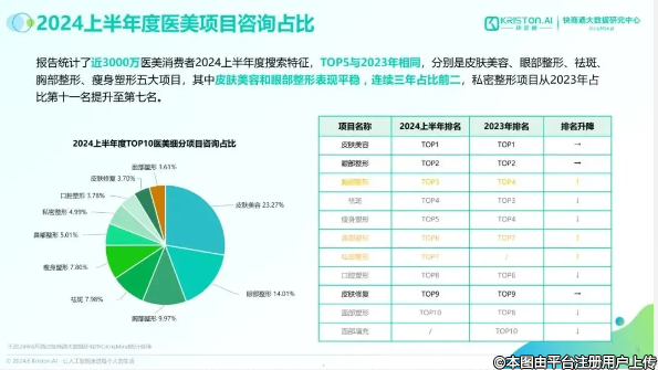 據(jù)2024上半年度醫(yī)美項(xiàng)目咨詢占比情況,在對近3000萬醫(yī)美消費(fèi)者進(jìn)行統(tǒng)計(jì)后發(fā)現(xiàn),“皮膚美容”已連續(xù)3年占據(jù)搜索榜單第一名。