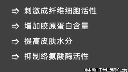 它主要的成分是有幾氨基酸,脯氨酸、甘氨酸、丙氨酸、賴氨酸以及肌肽、VC和透明質(zhì)酸鈉,它的功效主要是參與合成膠原蛋白,提供原料。