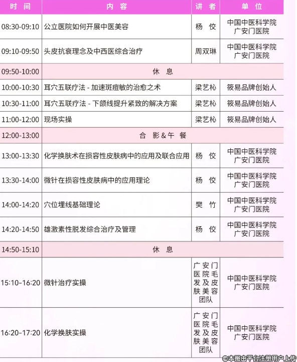 3、10月26-27日為學(xué)習(xí)班培訓(xùn)課程,以授課及實(shí)操為主,內(nèi)容包含中醫(yī)美容外治技術(shù),穴位埋線技術(shù),微針治療,化學(xué)換膚術(shù),脫發(fā)非藥物治療等,配置 6-7 名輔導(dǎo)老師,做到每個(gè)學(xué)員親自實(shí)操,培訓(xùn)結(jié)束后頒發(fā)中國(guó)整形美容協(xié)會(huì)培訓(xùn)證書。