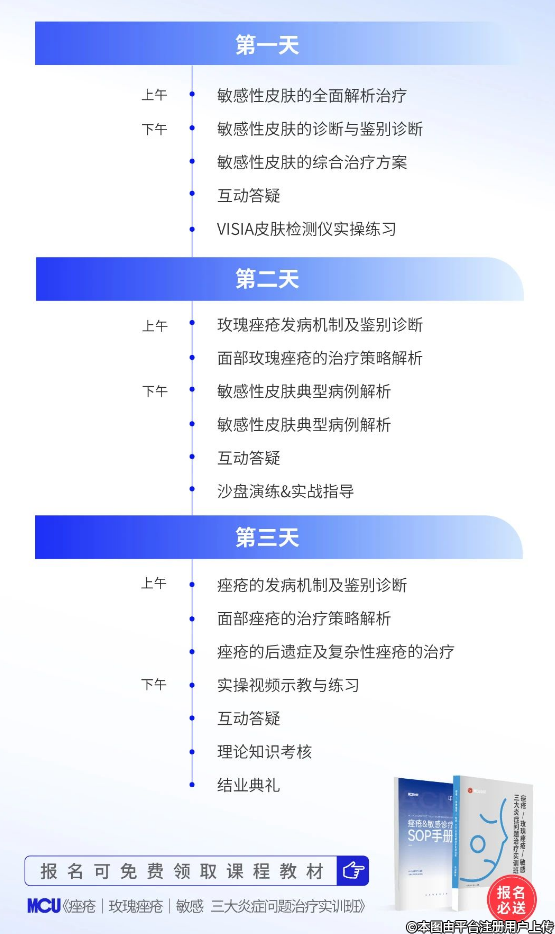 聚焦痤瘡、玫瑰痤瘡、敏感性皮膚等三大慢性炎癥問題的治療策略,全程圍繞診斷與鑒別診斷、10+案例現場分組研討、經典案例視頻全案剖析、一線療法實戰(zhàn)演示等4個維度展開授課,致力于學明白、會實操、有突破。