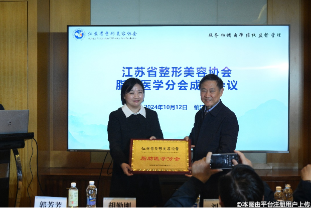胡勤剛會長向第一屆脂肪醫(yī)學分會頒發(fā)了分會銅牌,向郭芳芳主委及于海洲候任主委頒發(fā)了證書。郭芳芳主任委員發(fā)表了任職講話,表示將積極履行職責,為脂肪醫(yī)學領(lǐng)域發(fā)展貢獻力量。胡勤剛會長也發(fā)表講話,對分會未來發(fā)展寄予厚望,希望脂肪醫(yī)學分會隨著各項工作的有序開展,能為江蘇省乃至全國的脂肪醫(yī)學發(fā)展貢獻積極力量,為廣大群眾帶來更高質(zhì)量的醫(yī)療美容服務(wù)與體驗。
