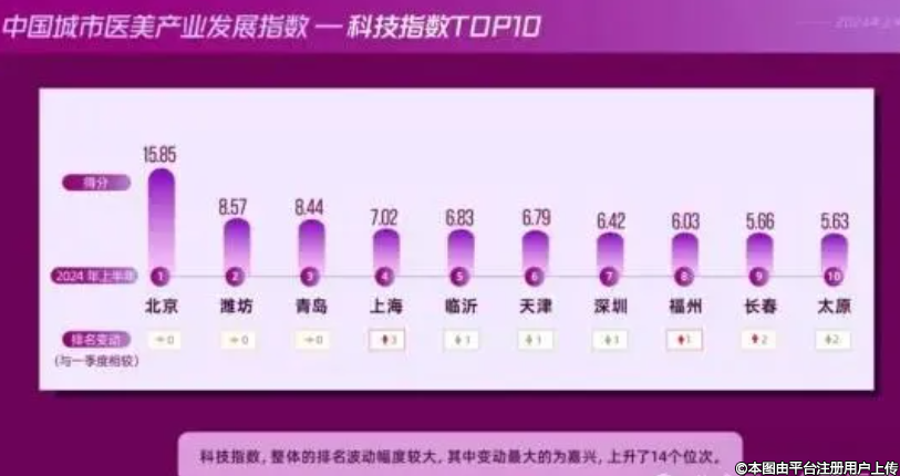 本期指數(shù)中有 44 座城市的排名發(fā)生了變化,占所有樣本城市的 88%,充分顯示出各城市間醫(yī)美產(chǎn)業(yè)競(jìng)爭(zhēng)的白熱化程度。這表明隨著醫(yī)美市場(chǎng)的不斷發(fā)展和技術(shù)的進(jìn)步,各個(gè)城市都在積極發(fā)力,試圖在醫(yī)美產(chǎn)業(yè)中占據(jù)一席之地。