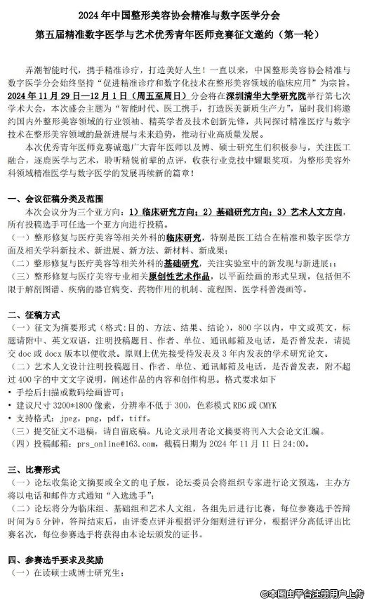 2024年中國(guó)整形美容協(xié)會(huì)精準(zhǔn)與數(shù)字醫(yī)學(xué)分會(huì)第五屆精準(zhǔn)數(shù)字醫(yī)學(xué)與藝術(shù)優(yōu)秀青年醫(yī)師競(jìng)賽征文邀約(第一輪)弄潮智能時(shí)代,攜手精準(zhǔn)診療,打造美好人生!一直以來(lái),中國(guó)整形美容協(xié)會(huì)精準(zhǔn)與數(shù)字醫(yī)學(xué)分會(huì)始終堅(jiān)持“促進(jìn)精準(zhǔn)診療和數(shù)字化技術(shù)在整形美容領(lǐng)域的臨床應(yīng)用”為宗旨。2024年11月29日—12月1日(周五至周日)分會(huì)將在深圳清華大學(xué)研究院舉行第七次學(xué)術(shù)大會(huì),本次盛會(huì)主題為“智能時(shí)代、醫(yī)工攜手,打造醫(yī)美新質(zhì)生產(chǎn)力”,屆時(shí)我們將邀約國(guó)內(nèi)外整形美容領(lǐng)域的行業(yè)領(lǐng)袖、精英學(xué)者及技術(shù)創(chuàng)新先鋒,共同探討精準(zhǔn)醫(yī)療與數(shù)字技術(shù)在整形美容領(lǐng)域的最新進(jìn)展與未來(lái)趨勢(shì),推動(dòng)行業(yè)高質(zhì)量發(fā)展。本次優(yōu)秀青年醫(yī)師競(jìng)賽誠(chéng)邀廣大青年醫(yī)師以及博、碩士研究生們積極參與,關(guān)注醫(yī)工融合,逐鹿醫(yī)學(xué)與藝術(shù),聆聽精銳前輩的點(diǎn)評(píng),收獲行業(yè)競(jìng)技中耀眼獎(jiǎng)項(xiàng),為整形美容外科領(lǐng)域精準(zhǔn)醫(yī)學(xué)與數(shù)字醫(yī)學(xué)的發(fā)展再續(xù)新的篇章!1會(huì)議征稿分類及范圍