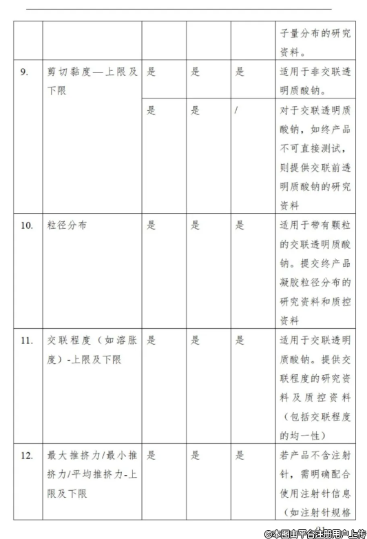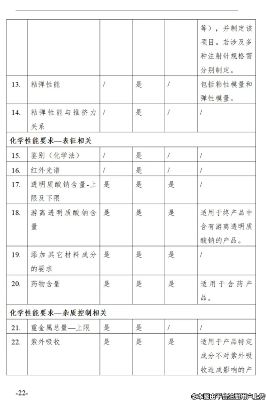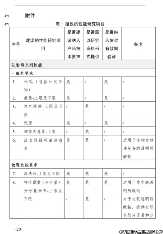 3.3對(duì)于整形美容用透明質(zhì)酸鈉類注射填充劑,性能研究項(xiàng)目包括但不限于附件表1中所列項(xiàng)目。注冊(cè)申請(qǐng)人需根據(jù)具體產(chǎn)品特性,考慮增加其他適用的性能研究項(xiàng)目。對(duì)于附件表格列舉的項(xiàng)目中,如有不適用項(xiàng),亦需說明具體理由。性能研究宜采用終產(chǎn)品,選擇典型型號(hào)規(guī)格。如受試驗(yàn)條件等因素影響,未使用終產(chǎn)品時(shí),需提供合理性分析,確認(rèn)未對(duì)試驗(yàn)結(jié)果及結(jié)論產(chǎn)生影響。研究項(xiàng)目所用樣本數(shù)量宜適當(dāng),說明樣本數(shù)量的確定依據(jù)。適用時(shí)對(duì)驗(yàn)證結(jié)果進(jìn)行統(tǒng)計(jì)學(xué)分析。