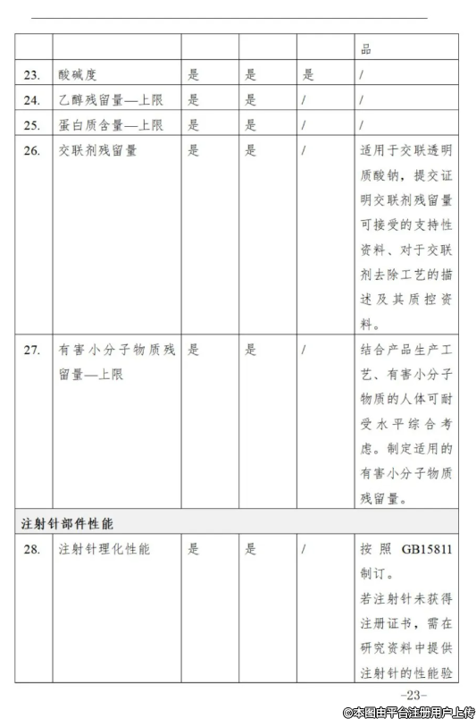 產(chǎn)品技術(shù)要求中無需制定灌封填充劑前空注射器的性能項(xiàng)目,應(yīng)針對(duì)裝有注射填充劑的注射器部件制定適用的性能項(xiàng)目。