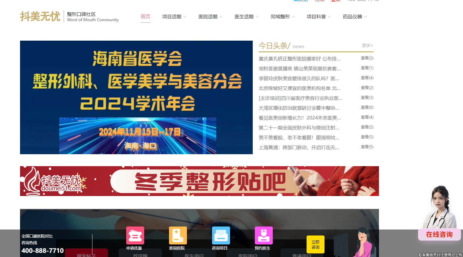 俗話說,多看,多問,總不會(huì)不錯(cuò)的。抖美無憂平臺(tái)實(shí)時(shí)收集、匯總了全網(wǎng)公開的給類醫(yī)美相關(guān)信息,為求美者提示就醫(yī)風(fēng)險(xiǎn)、醫(yī)美行業(yè)發(fā)展趨勢、還提供在線免費(fèi)咨詢的服務(wù),供醫(yī)美求美者了解到新的醫(yī)美市場發(fā)展趨勢。