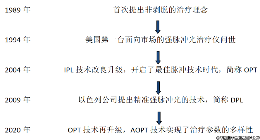1989年,國(guó)外學(xué)者提出了非剝脫的治療理念,就是通過(guò)高強(qiáng)度閃光燈發(fā)射強(qiáng)脈沖光來(lái)治療皮膚疾病。