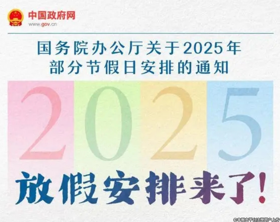 國(guó)務(wù)院辦公廳印發(fā)《關(guān)于2025年部分節(jié)假日安排的通知》,哪天放假、怎么調(diào)休?中國(guó)政府網(wǎng)帶你一圖看懂。