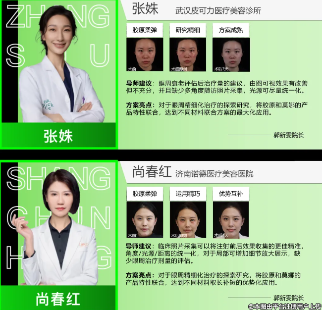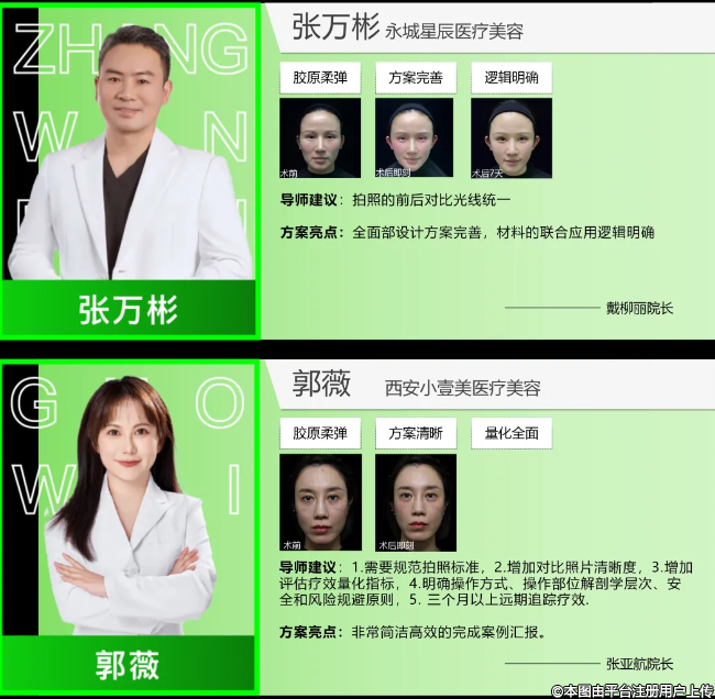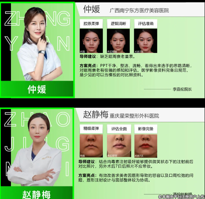 本次大賽的圓滿成功,除了參賽醫(yī)生的出色表現(xiàn),“莫娜天團導(dǎo)師”的專業(yè)姿態(tài)同樣功不可沒。5位大咖專家分別從注射的精準(zhǔn)度、安全性、案例效果及材料理解4個維度對參賽案例逐一打分,分享專業(yè)經(jīng)驗,提出深入見解。