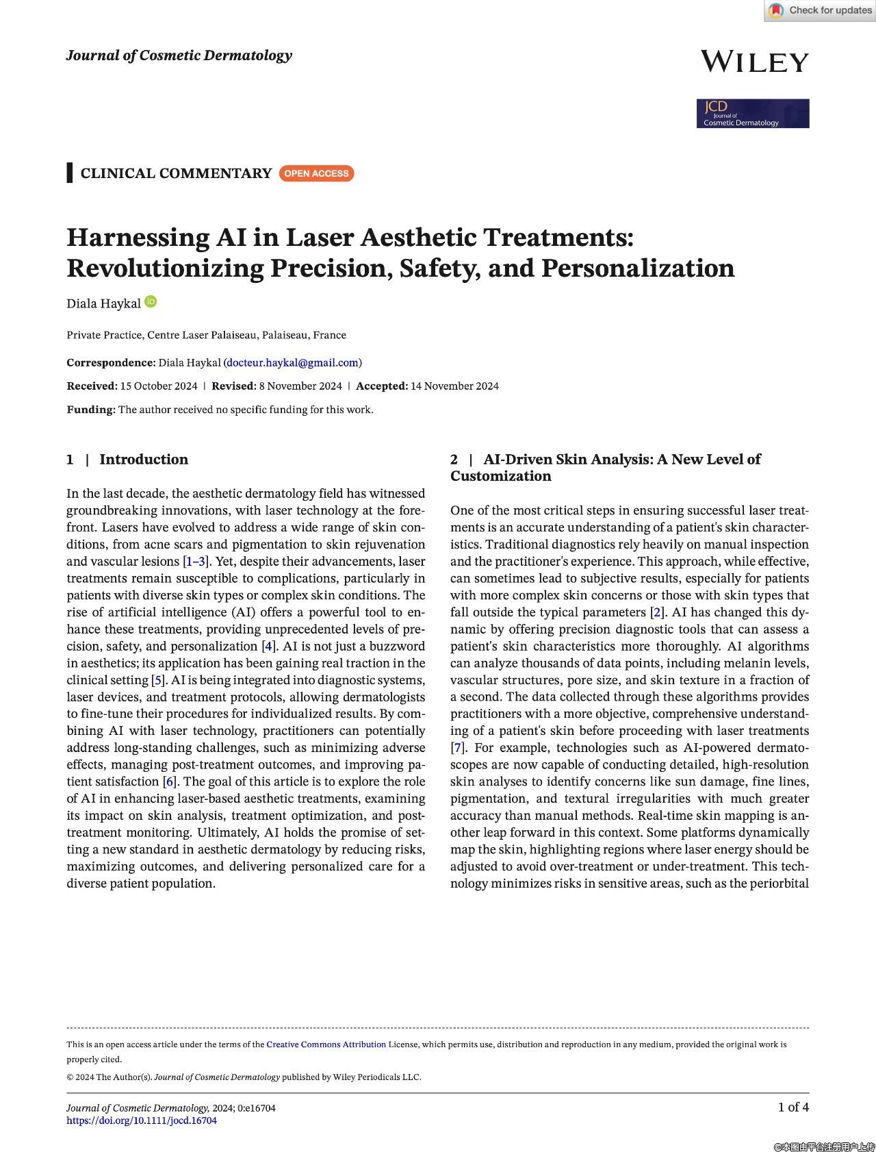 過去十年間,美容皮膚科領(lǐng)域因激光技術(shù)的創(chuàng)新而發(fā)生了顯著變革,激光技術(shù)始終處于該領(lǐng)域發(fā)展的前沿。激光已逐漸發(fā)展成為一種能夠有效治療多種皮膚狀況的手段,其應(yīng)用范圍涵蓋了從痤瘡疤痕、色素沉著到皮膚年輕化以及血管病變等諸多方面。雖然激光技術(shù)取得了長(zhǎng)足的進(jìn)步,但在實(shí)際應(yīng)用中,激光治療并非毫無風(fēng)險(xiǎn),尤其是在面對(duì)皮膚類型各異或者皮膚狀況較為復(fù)雜的患者時(shí),仍然容易出現(xiàn)各種并發(fā)癥。人工智能(AI)技術(shù)的興起,為改善激光治療效果提供了一種極具潛力的強(qiáng)大工具。AI 技術(shù)的應(yīng)用能夠在激光治療過程中提供前所未有的高精度、高安全性以及高度個(gè)體化的治療方案。如今在醫(yī)美領(lǐng)域,人工智能已經(jīng)不再只是一個(gè)熱門的流行詞匯,其在臨床實(shí)踐中的應(yīng)用正逐漸獲得實(shí)質(zhì)性的進(jìn)展和廣泛的認(rèn)可。目前,人工智能技術(shù)正在逐步融入到診斷系統(tǒng)、激光設(shè)備以及治療方案等各個(gè)環(huán)節(jié)之中,這使得醫(yī)生能夠更加精細(xì)地調(diào)整治療程序,為每一位患者提供更加個(gè)體化的治療結(jié)果。將人工智能技術(shù)與激光技術(shù)結(jié)合,有望克服激光治療長(zhǎng)期面臨的諸多挑戰(zhàn),例如如何最大程度地減少治療過程中的不良反應(yīng)、如何更加有效地管理治療后的效果以及如何顯著提高患者對(duì)治療的滿意度等。本文旨在深入探討人工智能技術(shù)在提升激光美容治療效果方面可能發(fā)揮的重要作用,詳細(xì)論述其對(duì)皮膚分析、治療優(yōu)化以及治療后監(jiān)測(cè)等環(huán)節(jié)的深遠(yuǎn)影響。人工智能技術(shù)有望通過降低治療風(fēng)險(xiǎn)、最大化治療效果以及為不同患者群體提供更加個(gè)性化的護(hù)理服務(wù),在美容皮膚治療領(lǐng)域樹立全新標(biāo)準(zhǔn)。