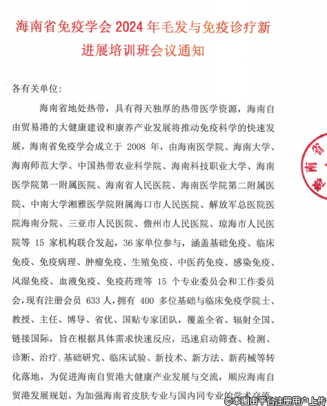 海南省免疫學(xué)會 2024 年毛發(fā)與免疫診療新進(jìn)展培訓(xùn)班會議通知
