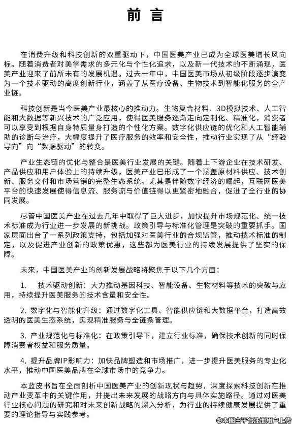 本藍皮書旨在全面剖析中國醫(yī)美產(chǎn)業(yè)的創(chuàng)新現(xiàn)狀與趨勢,深度探索科技創(chuàng)新在推動產(chǎn)業(yè)變革中的關(guān)鍵作用,并提出未來發(fā)展的戰(zhàn)略方向與具體實施路徑。通過對醫(yī)美行業(yè)核心問題的研究和對未來創(chuàng)新戰(zhàn)略的深入分析,為行業(yè)的持續(xù)健康發(fā)展提供了重要的理論指導(dǎo)與實踐參考。