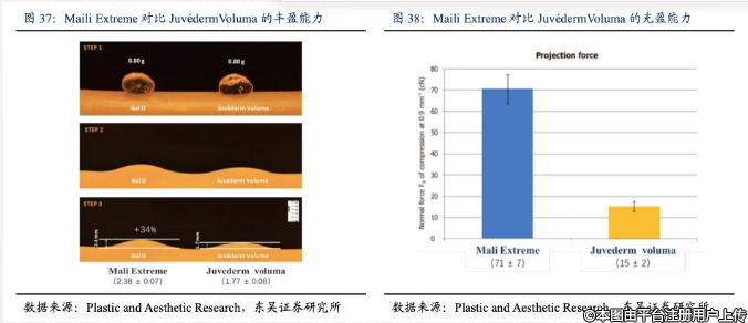 根據(jù)Plastic and Aesthetic Research和東吳證券研究所報(bào)告,在與艾爾健喬雅登品牌的Juvéderm Voluma的對(duì)比試驗(yàn)中,應(yīng)用OxiFree?專利技術(shù)的透明質(zhì)酸凝膠產(chǎn)品MaiLi?Extreme的豐盈程度高出34%,與此同時(shí)MaiLi?Extreme所需注射的凝膠減少了24%。