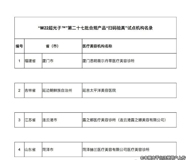 根據(jù)通知中“掃碼驗真試點機構”入選標準及流程,截至2025年2月14日審核通過4家醫(yī)療美容機構為第二十七批合規(guī)產(chǎn)品“掃碼驗真試點機構”(具體名單見附件)?,F(xiàn)予以公布。