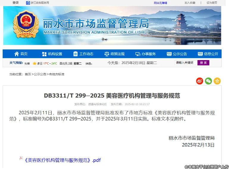 近日,浙江省麗水市市場監(jiān)督管理局批準發(fā)布了該市地方標準《美容醫(yī)療機構(gòu)管理與服務(wù)規(guī)范》,標準編號為DB3311/T 299─2025,并將于2025年3月11日開始實施。