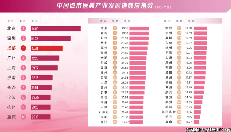 從城市醫(yī)美產(chǎn)業(yè)綜合指數(shù)看,北京、深圳分列第一、第二位。成都排名第三,較2023年度上升一位。官遠(yuǎn)星表示,圍繞“醫(yī)美之都”建設(shè),成都通過政策支持、城市特質(zhì)、經(jīng)濟發(fā)展、產(chǎn)業(yè)升級等外部引導(dǎo)和保障,醫(yī)美產(chǎn)業(yè)持續(xù)發(fā)展壯大,已經(jīng)成為構(gòu)建現(xiàn)代產(chǎn)業(yè)體系的重要優(yōu)勢賽道。