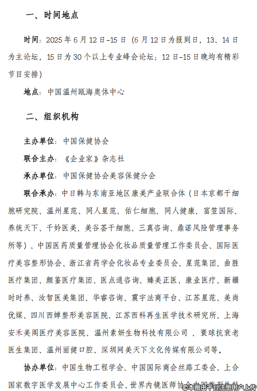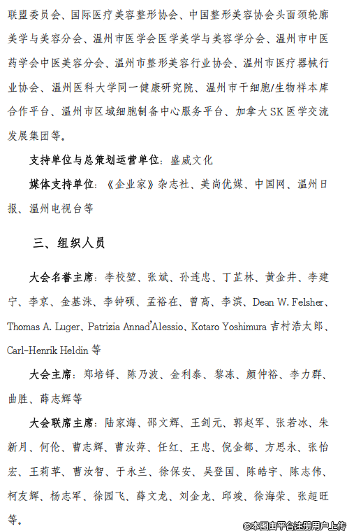 協(xié)辦單位:中國生物工程學(xué)會、中國國際商會絲路工委會、上合國家數(shù)字醫(yī)學(xué)發(fā)展中心工作委員會、世界內(nèi)鏡醫(yī)師協(xié)會中國整形外科聯(lián)盟委員會、國際醫(yī)療美容整形協(xié)會、中國整形美容協(xié)會頭面頸輪美學(xué)與美容分會、溫州市醫(yī)學(xué)會醫(yī)學(xué)美學(xué)與美容學(xué)分會、溫州市中醫(yī)藥學(xué)會中醫(yī)美容分會、溫州市整形美容行業(yè)協(xié)會、溫州市醫(yī)療器械行業(yè)協(xié)會、溫州醫(yī)科大學(xué)同一健康研究院、溫州市千細(xì)胞/生物樣本庫合作平臺、溫州市區(qū)域細(xì)胞制備中心服務(wù)平臺、加拿大SK醫(yī)學(xué)交流發(fā)展集團(tuán)等,