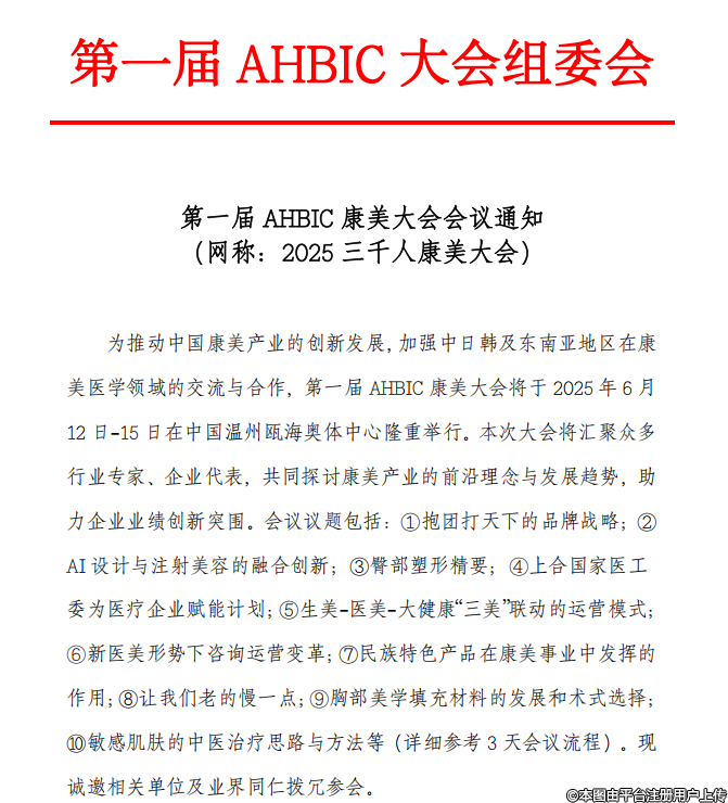 為推動中國康美產(chǎn)業(yè)的創(chuàng)新發(fā)展,加強(qiáng)中日韓及東南亞地區(qū)在康美醫(yī)學(xué)領(lǐng)域的交流與合作,第一屆 AHBIC 康美大會將于2025 年6月12 日-15 日在中國溫州甌海奧體中心隆重舉行。本次大會將匯聚眾多行業(yè)專家、企業(yè)代表,共同探討康美產(chǎn)業(yè)的前沿理念與發(fā)展趨勢,助力企業(yè)業(yè)績創(chuàng)新突圍。會議議題包括:①抱團(tuán)打天下的品牌戰(zhàn)略;②AI設(shè)計與注射美容的融合創(chuàng)新;③臀部塑形精要:4上合國家醫(yī)工委為醫(yī)療企業(yè)賦能計劃:⑤生美-醫(yī)美-大健康“三美”聯(lián)動的運營模式:⑥新醫(yī)美形勢下咨詢運營變革;⑦民族特色產(chǎn)品在康美事業(yè)中發(fā)揮的作用;⑧讓我們老的慢一點;⑨胸部美學(xué)填充材料的發(fā)展和術(shù)式選擇⑩敏感肌膚的中醫(yī)治療思路與方法等(詳細(xì)參考3天會議流程)?,F(xiàn)誠邀相關(guān)單位及業(yè)界同仁撥冗參會。
