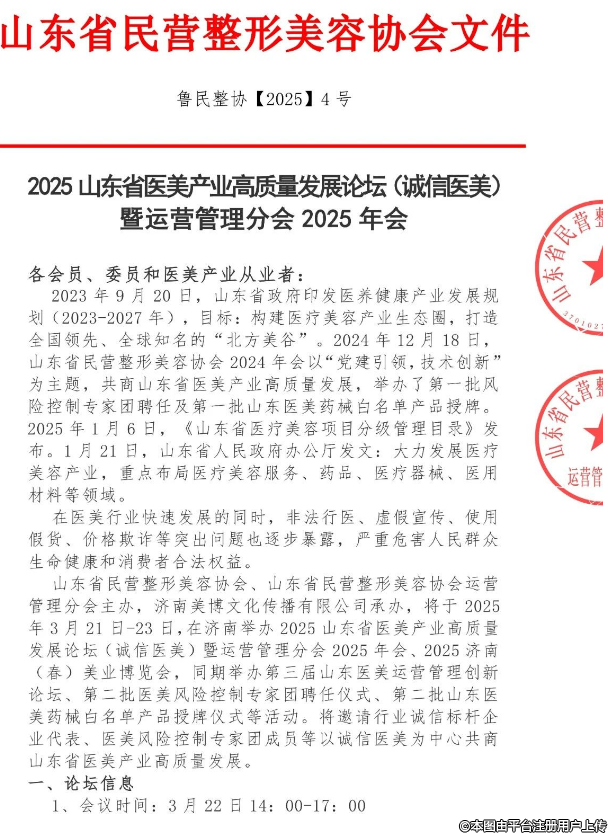 3月22日運營管理分會2025年會暨2025山東省醫(yī)美產(chǎn)業(yè)高質量發(fā)展論壇(誠信醫(yī)美)
