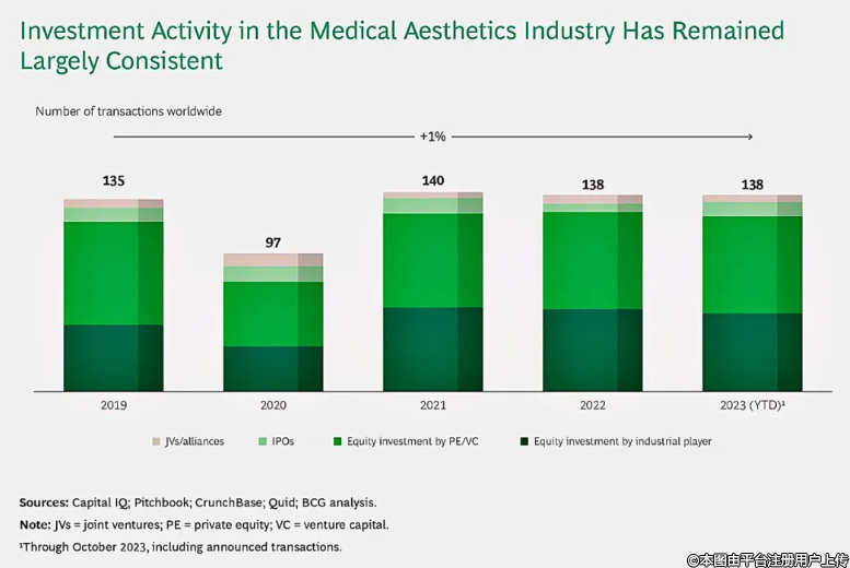 行業(yè)參與者的股權(quán)投資:醫(yī)美公司也進(jìn)行戰(zhàn)略性股權(quán)投資,收購其他公司的股份,以實(shí)現(xiàn)產(chǎn)品組合的多元化并創(chuàng)造協(xié)同效應(yīng)。例如,生產(chǎn)填充劑的生物再生醫(yī)學(xué)公司 CG Bio 最近收購了面部埋線制造商 M.Base,以實(shí)現(xiàn)其產(chǎn)品組合的多元化。