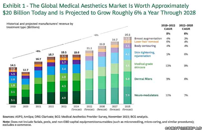 圖1. 目前全球醫(yī)美市場價值約200億美元,預(yù)計(jì)到2028年每年增長約6%。