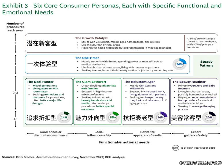 前四種消費(fèi)者類型屬于穩(wěn)定客群(每年接受兩次或更多醫(yī)美治療者)。