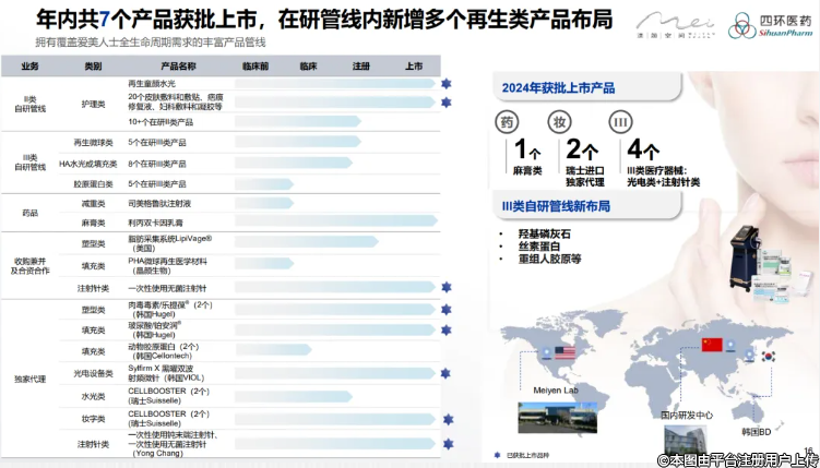 截止目前共有了13款醫(yī)美產(chǎn)品,其中獨(dú)家代理的產(chǎn)品管線有7款,包括肉毒素Letybo?樂提葆、玻尿酸Persnica®鉑安潤(rùn)、美塑水光系列CELLBOOSTER®、黃金微針SYLFIRM X、微通道系統(tǒng)DermaFrac、脂肪采集系統(tǒng)LipiVage、愛拉絲提ELASTY等;自研產(chǎn)品管線中共有10余款I(lǐng)II類醫(yī)療器械產(chǎn)品,包括童顏針、少女針等。