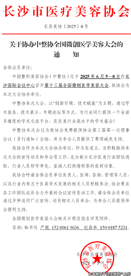 中國整形美容協(xié)會(中整協(xié))定于2025年6月5-8日在長沙國際會議中心召開第十三屆全國微創(chuàng)醫(yī)學(xué)美容大會。我協(xié)會為本次大會協(xié)辦單位。