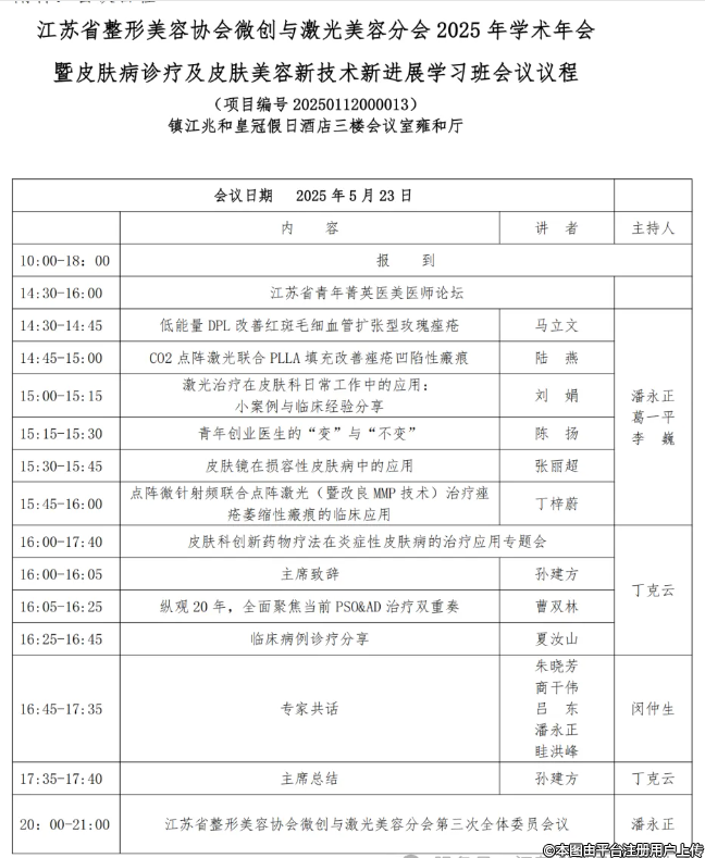 為發(fā)揮江蘇省整形美容協(xié)會微創(chuàng)與激光美容分會的引領作用,推動我省醫(yī)療美容皮膚與激光美容事業(yè)的發(fā)展,經(jīng)協(xié)會研究,由江蘇省整形美容協(xié)會主辦、鎮(zhèn)江市第一人民醫(yī)院承辦的江蘇省整形美容協(xié)會微創(chuàng)與激光美容分會2025年學術年會暨皮膚病診療及皮膚美容新技術新進展學習班(項目編號:20250112000013)定于2025年5月23-25日在鎮(zhèn)江召開。現(xiàn)將會議有關事宜通知如下: