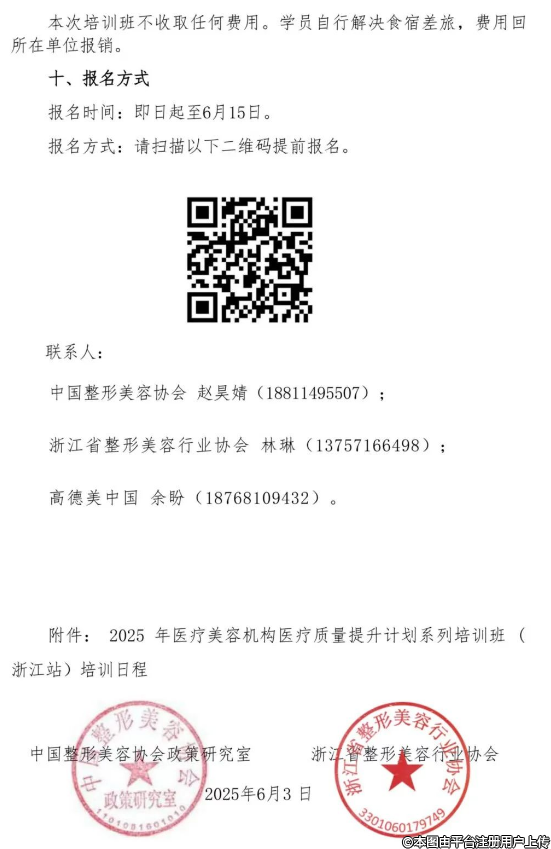 各醫(yī)療美容機(jī)構(gòu):為加強(qiáng)醫(yī)療美容機(jī)構(gòu)規(guī)范管理,促進(jìn)醫(yī)療美容機(jī)構(gòu)高質(zhì)量發(fā)展,中國(guó)整形美容協(xié)會(huì)聯(lián)合浙江省整形美容行業(yè)協(xié)會(huì)擬于6月25日在杭州舉辦”醫(yī)療美容機(jī)構(gòu)醫(yī)療質(zhì)量提升計(jì)劃系列培訓(xùn)班”。現(xiàn)將第三期(浙江站)培訓(xùn)班通知轉(zhuǎn)發(fā)如下,請(qǐng)大家踴躍報(bào)名。本次培訓(xùn)班不收取任何費(fèi)用。