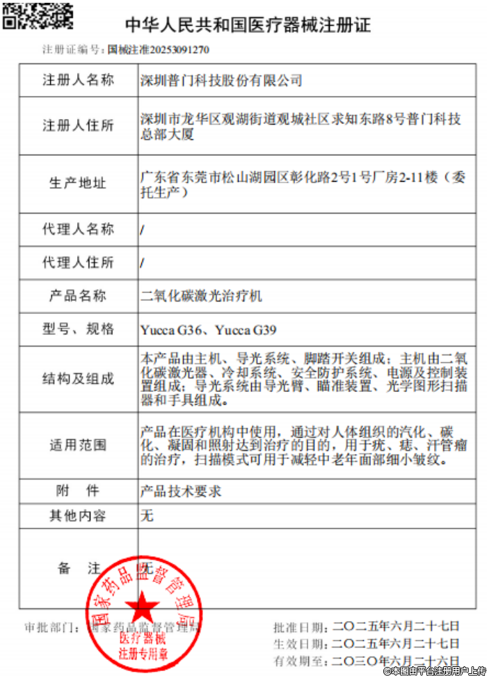 近日,普門科技旗下Ⅲ類醫(yī)療器械「二氧化碳激光治療機」正式獲得國家藥監(jiān)局批準上市,國械注準為20253091270,獲批適應(yīng)癥為“在醫(yī)療機構(gòu)中使用,通過對人體組織的汽化、碳化、凝固和照射達到治療的目的,用于疣、痣、汗管瘤的治療,掃描模式可用于減輕中老年面部細小皺紋。”