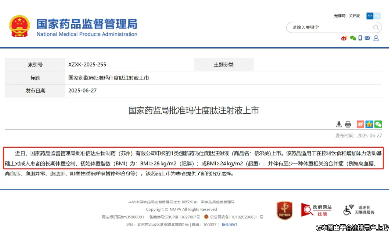6月27日,信達生物制藥集團宣布,其旗下信爾美®(胰高血糖素[GCG] /胰高血糖素樣肽-1[GLP-1] 雙受體激動劑,瑪仕度肽注射液)瑪仕度肽注射液獲得國家藥品監(jiān)督管理局(NMPA)批準,用于成人肥胖或超重患者的長期體重控制。