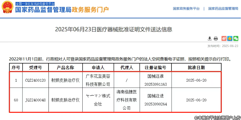 近日,國家藥品監(jiān)督管理局(NMPA)發(fā)布最新醫(yī)療器械批準信息,兩款射頻皮膚治療儀正式獲批Ⅲ類醫(yī)療器械認證,標志著中國醫(yī)美器械領(lǐng)域再迎技術(shù)突破。此次獲批的產(chǎn)品分別來自廣東花至美容科技有限公司和ャ一マン株式會社(海南倍捷醫(yī)療科技有限公司代理),將進一步豐富國內(nèi)合規(guī)醫(yī)美器械市場選擇,推動行業(yè)規(guī)范化發(fā)展。