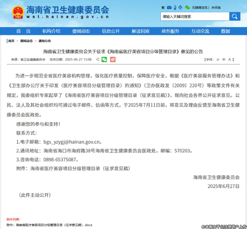 意見稿全文,可查看通知附件“海南省醫(yī)療美容項(xiàng)目分級(jí)管理目錄(征求意見稿).docx”。