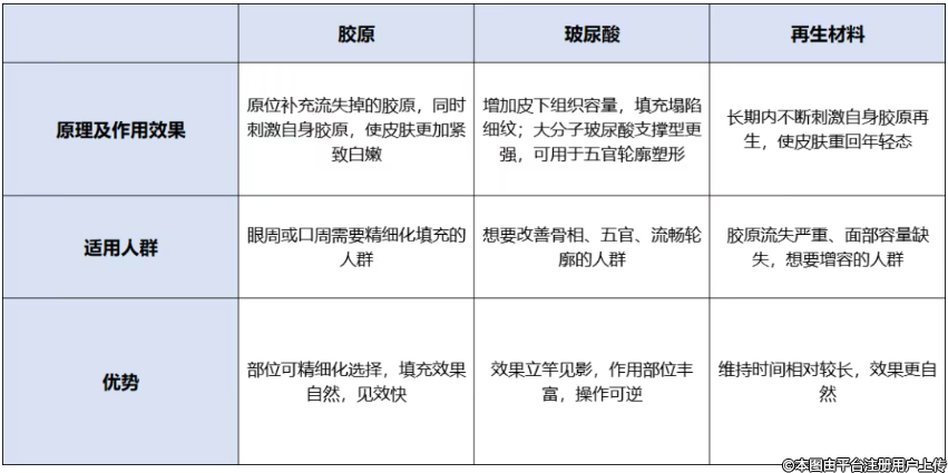 現(xiàn)在市面上注射填充的材料這么多,該怎么選?今兒咱們就幾種主流材料來(lái)邊對(duì)比邊聊聊。講講膠原vs玻尿酸vs再生材料,這三大類常見(jiàn)材料的特性、適應(yīng)類型、優(yōu)缺點(diǎn),幫助大家做選擇。