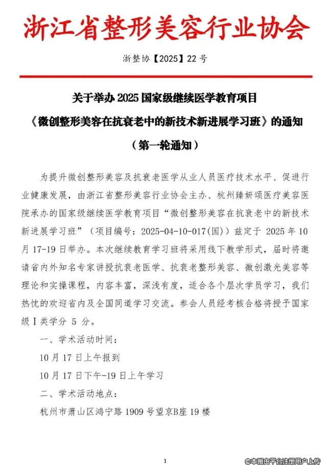 為提升微創(chuàng)整形美容及抗衰老醫(yī)學從業(yè)人員醫(yī)療技術水平、促進行業(yè)健康發(fā)展,由浙江省整形美容行業(yè)協(xié)會主辦、杭州臻妍頌醫(yī)療美容醫(yī)院承辦的國家級繼續(xù)醫(yī)學教育項目“微創(chuàng)整形美容在抗衰老中的新技術新進展學習班”(項目編號:2025-04-10-017(國))茲定于2025年10月17-19日舉辦。本次繼續(xù)教育學習班將采用線下教學形式,屆時將邀請省內外知名專家講授抗衰老醫(yī)學、抗衰老整形美容、微創(chuàng)激光美容等理論和實操課程,內容豐富,深淺有度,適合各個層次學員學習,我們熱忱的歡迎省內及全國同道學習交流。參會人員經(jīng)考核合格將授予國家級I類學分 5分。