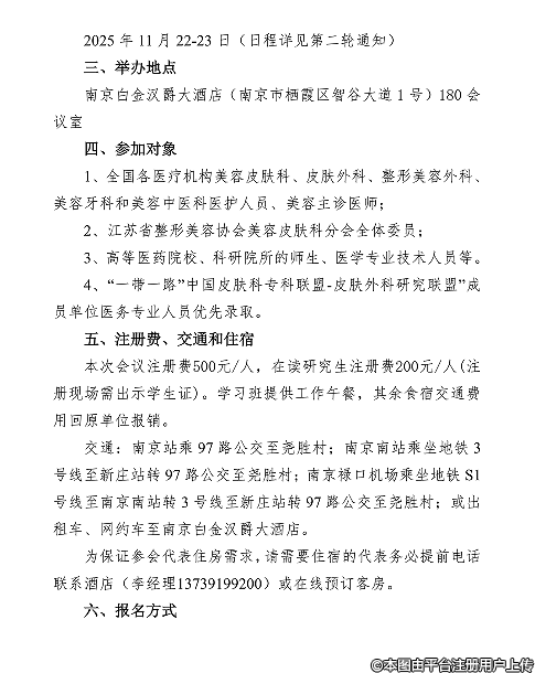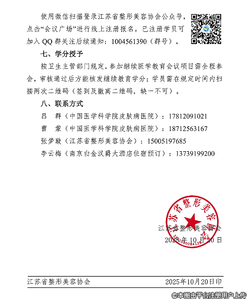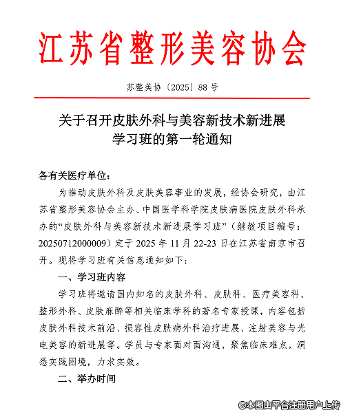 為推動(dòng)皮膚外科及皮膚美容事業(yè)的發(fā)展,經(jīng)協(xié)會(huì)研究,由江蘇省整形美容協(xié)會(huì)主辦、中國(guó)醫(yī)學(xué)科學(xué)院皮膚病醫(yī)院皮膚外科承辦的“皮膚外科與美容新技術(shù)新進(jìn)展學(xué)習(xí)班”定于2025年11月22-23日在江蘇省南京市召開。