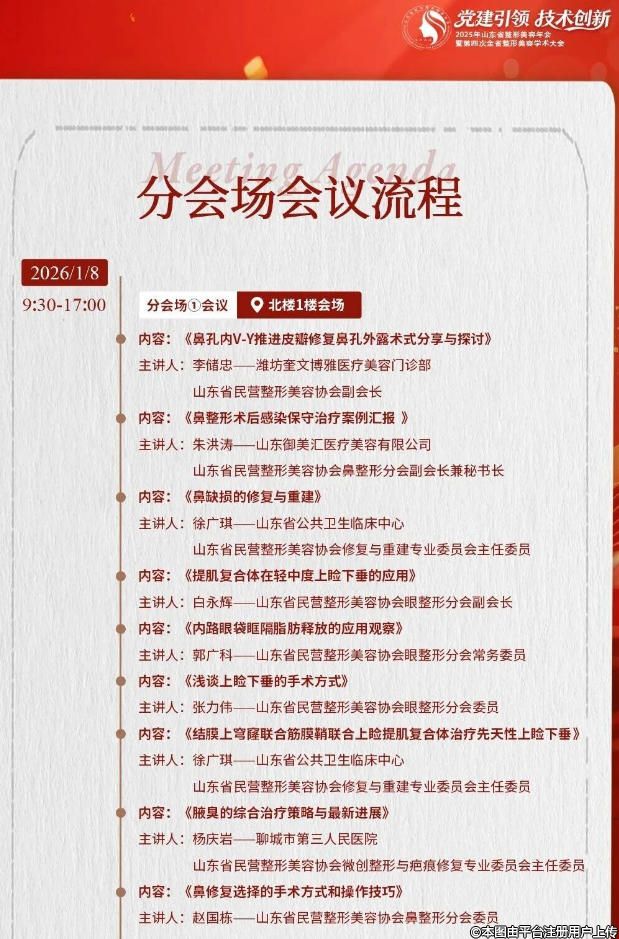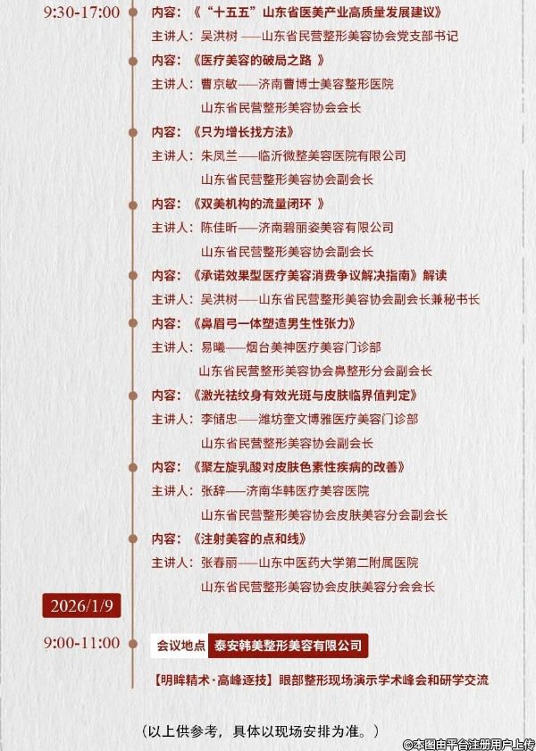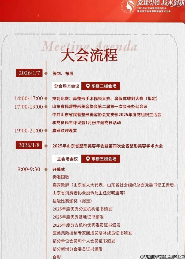 根據(jù)《山東省民營(yíng)整形美容協(xié)會(huì)章程》的規(guī)定,結(jié)合協(xié)會(huì)工作安排,茲定于2026年1月7日-1月9日在泰安召開(kāi)2025年山東省整形美容年會(huì)暨第四次全省整形美容學(xué)術(shù)大會(huì)。大會(huì)以“黨建引領(lǐng),技術(shù)創(chuàng)新”為主題,共商山東醫(yī)美產(chǎn)業(yè)高質(zhì)量發(fā)展。