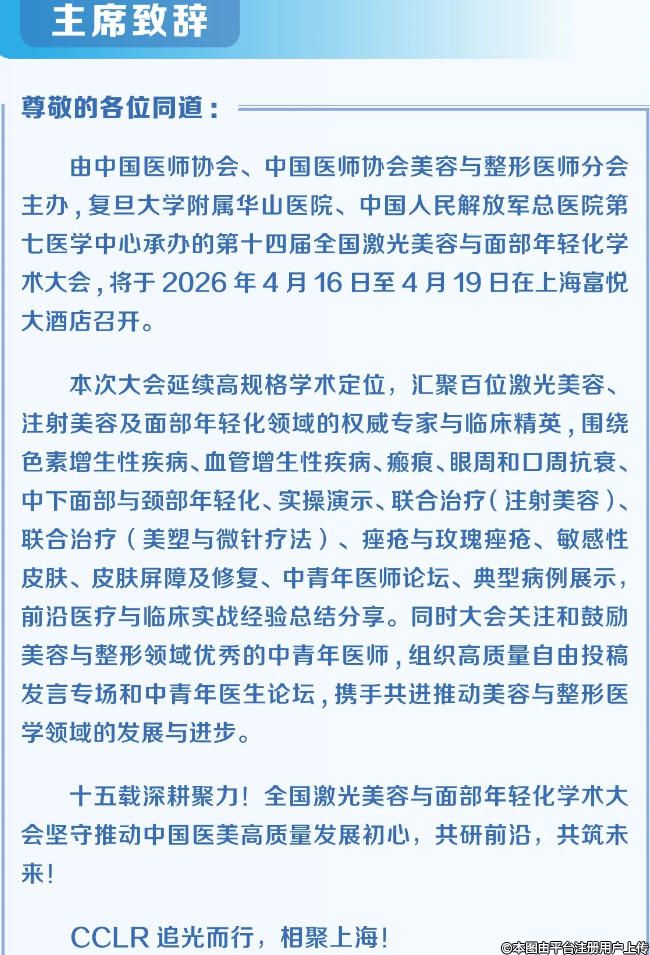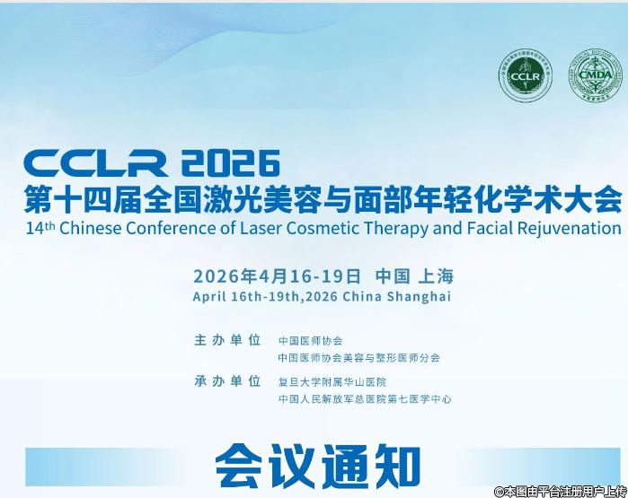 由中國(guó)醫(yī)師協(xié)會(huì)、中國(guó)醫(yī)師協(xié)會(huì)美容與整形醫(yī)師分會(huì)主辦,復(fù)旦大學(xué)附屬華山醫(yī)院、中國(guó)人民解放軍總醫(yī)院第七醫(yī)學(xué)中心承辦的第十四屆全國(guó)激光美容與面部年輕化學(xué)術(shù)大會(huì),將于 2026 年4月16 日至4月19 日在上海富悅大酒店召開(kāi)。